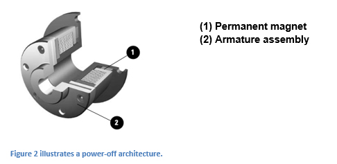 In normal power-off mode, the permanent magnet in the assembly (1) creates an attractive force on the armature assembly (2), which is attached to the load shaft by means of screws or pins, hence stopping or holding the load.