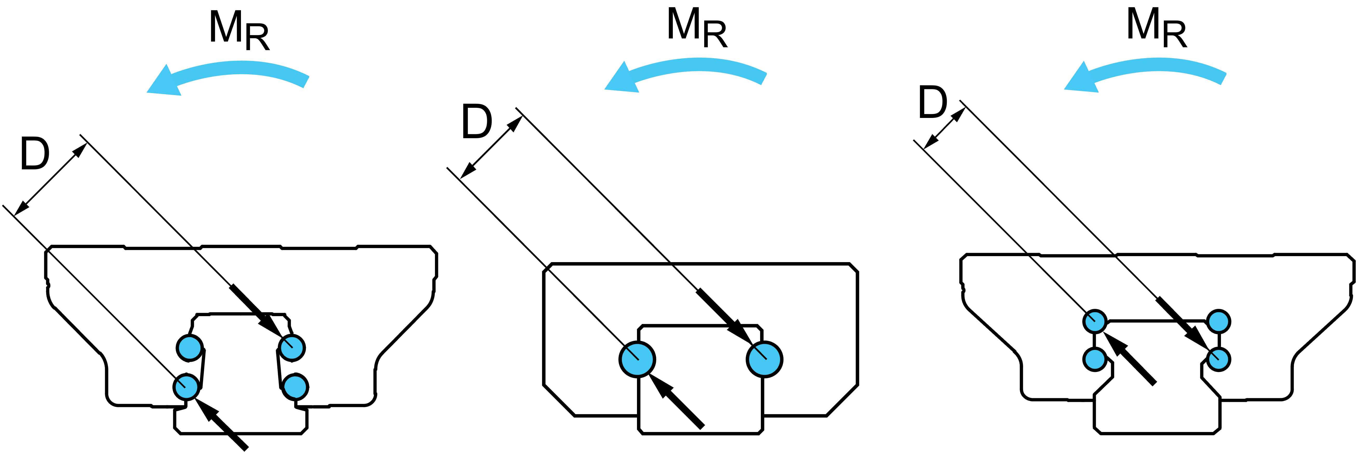 - Double-faced architecture arranges four ball bearing tracks (each with two contact points) higher on the rail to increase compliance while minimizing the negative impact on the moment arm “D.”